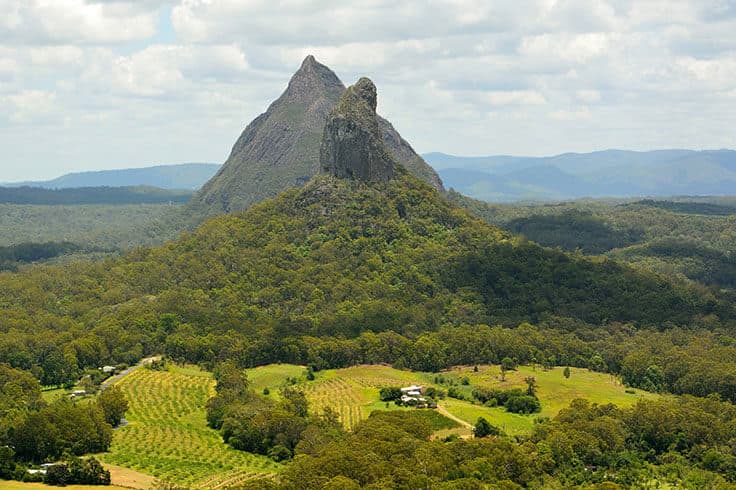 The Glass House Mountains are in the Sunshine Coast hinterlands and recognised as one of South East Queensland’s most iconic skylines. The 11 lofty peaks dominate over open forests, pine plantations, and wide grasslands.